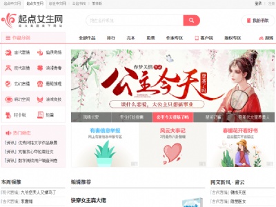 起點女生網起點女生網是女性小說原創門戶,包括古代言情小說、仙俠奇緣、浪漫青春、玄幻言情 、懸疑推理、..